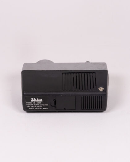 This is a vintage Shira bicycle burglar alarm AM/CB radio, model number 6950. It is made of plastic and metal, with a black and silver finish. It has an orange and yellow 'Shira' logo on the front. The radio is marked as made in Hong Kong. This unique device combines security with entertainment, designed to protect your bike while offering AM/CB radio functionality. The radio is in good vintage condition, considering its age. Some surface wear may be present. It would be a great decor piece for a collector of vintage electronics or cycling memorabilia.