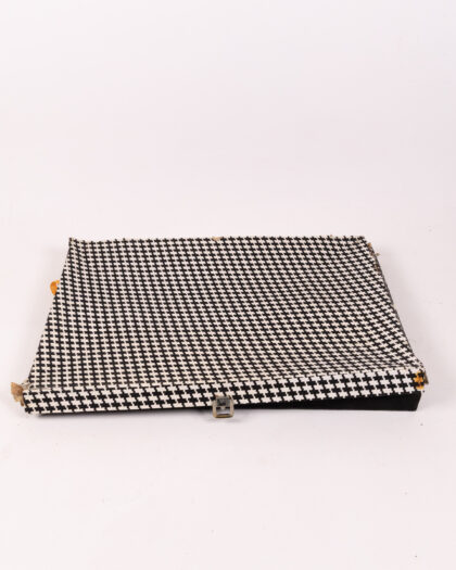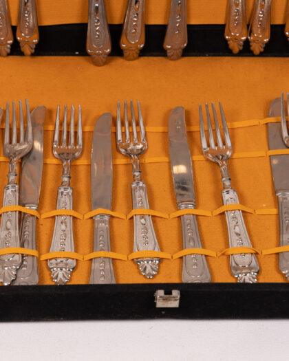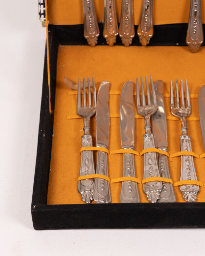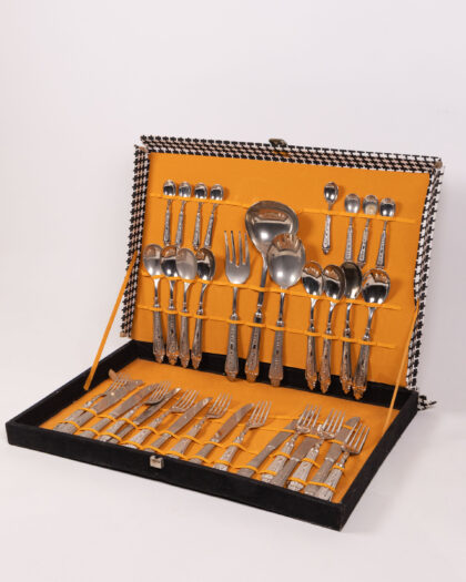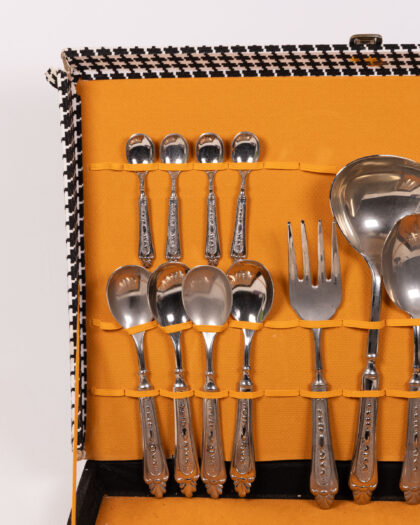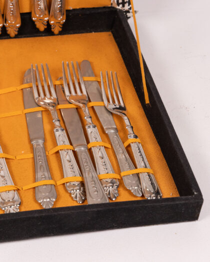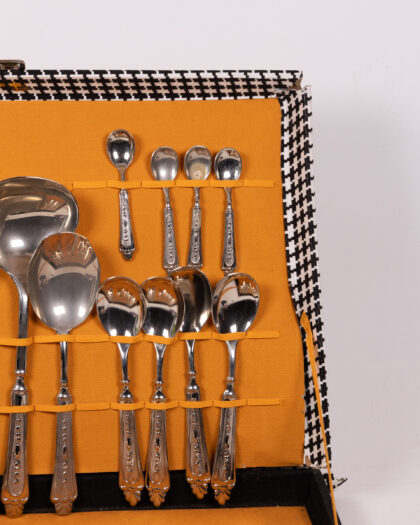 Elegant boxed set of silver flatware. The set consists of multiple place settings of knives, forks, spoons, and serving utensils, all neatly arranged in a fitted case with a black and white patterned exterior and yellow felt interior. The flatware features a decorative design on the handles. The case is sturdy and well-constructed, ensuring safe storage and transport. Ideal for formal dining or adding a touch of sophistication to everyday meals. Appears to be in excellent condition.