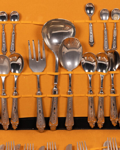 Elegant silver flatware set in fitted case. Multiple place settings. Decorative handles. Great for formal dining or everyday use. Excellent condition.