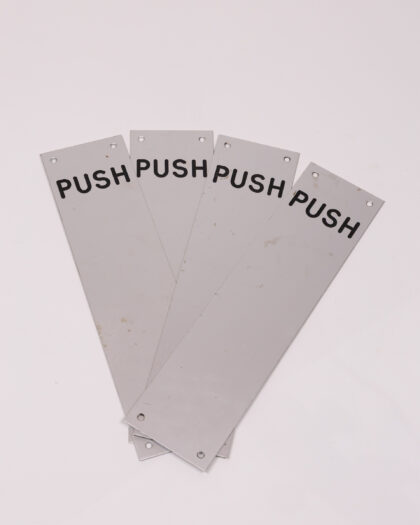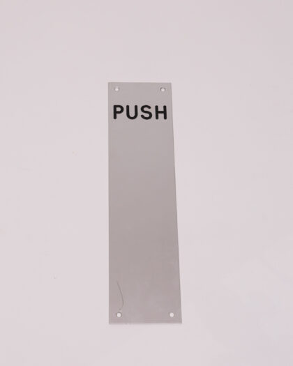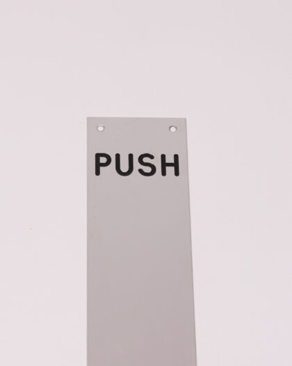 Silver metal door push plate with 'PUSH' in black text. Functional and durable. Ideal for homes or commercial spaces, offering a clean, industrial look.