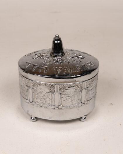 This exquisite silver decorative box features detailed engravings, showcasing architectural designs around its circumference. The lid is adorned with elegant patterns and text, adding a touch of cultural richness. Perfect for collectors or as a unique decorative piece. The box stands on small rounded feet, enhancing its elegance.