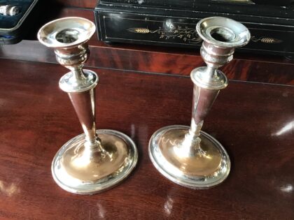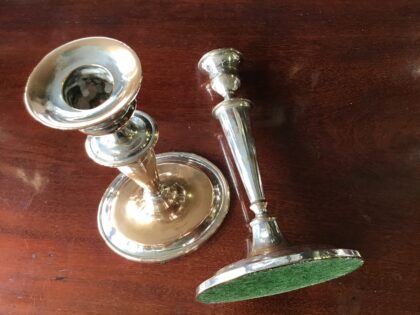 Pair of oval candlesticks. Silver plate on copper. Silver plate heavily rubbed off but this gives quite a nice interesting worn look for something different. 27cm.