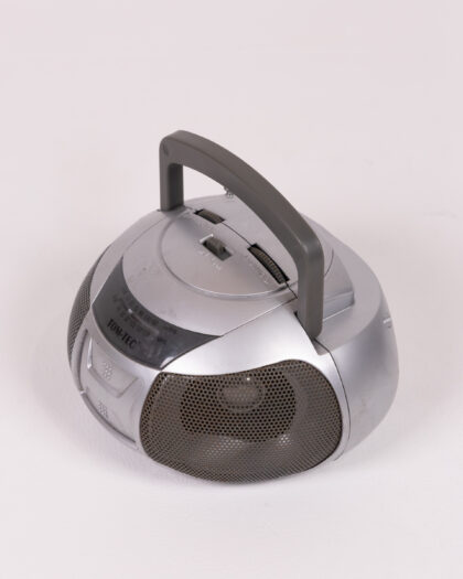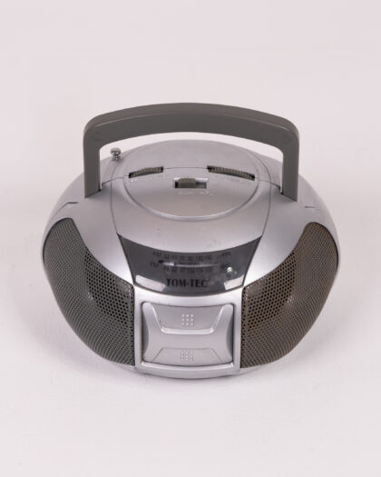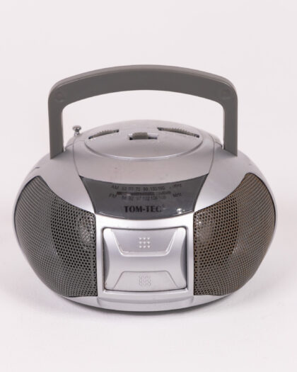 TOM-TEC silver radio with grey handle, black speaker mesh. Perfect for music lovers! In good condition.