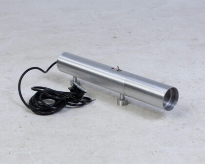 A sleek, cylindrical up or down wall light. It is crafted from brushed aluminium and features a minimalist design. The light has a black cord and a three-pin UK plug. A red on/off switch is located on the body of the lamp. The lamp has a modern appearance. It shows minimal wear. This has been recently PAT tested by our in-house electrician.