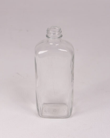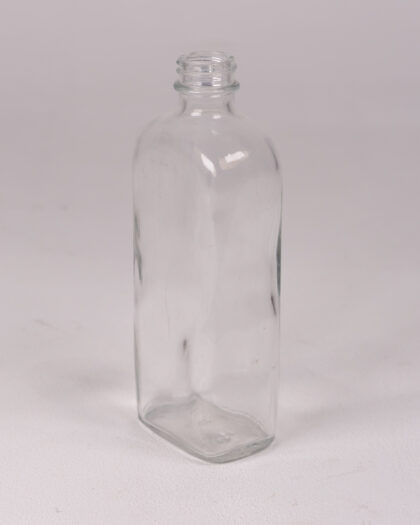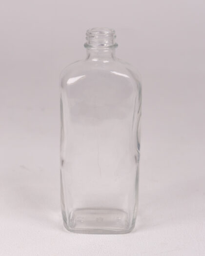 This is a clear glass bottle with a square body and rounded edges. The neck is narrow and smooth, and the overall shape is simple and modern. The glass is clear, and the bottle is empty. It appears to be in good condition, with no chips or cracks visible. It could be used for decorative purposes, storing liquids, or as a vase for flowers.