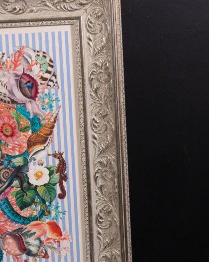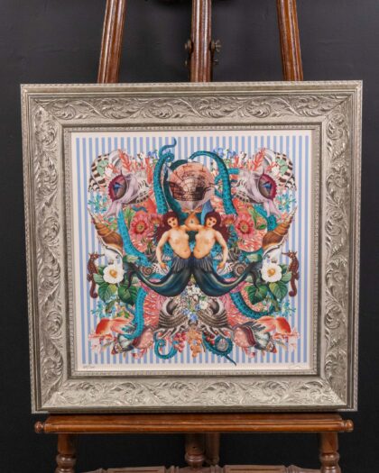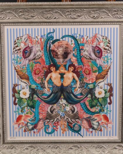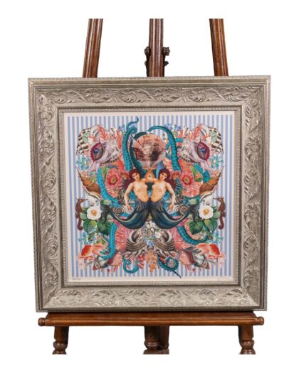 This striking framed print is by Myrtle and Mary and features a unique nautical mermaid design. The artwork includes mermaids, seashells, and a sailing ship, set against a striped background and mounted in a silver frame. Would suit a number of interiors. Excellent condition. Ready to hang and enjoy.