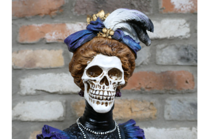 This striking Victorian-style skeleton bust features intricate details, including a feathered hat and elegant attire.