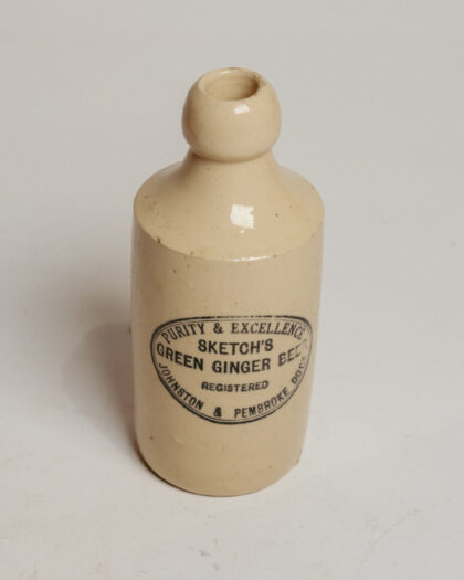 A brown, two-tone stoneware bottle for Sketch's Green Ginger Beer Johnston & Pembroke Dock. Bears impressed Price Bristol maker's mark.