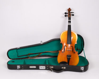 Vintage Skylark brand violin with case. The violin has a warm, honey-colored finish. The case is black with a green velvet interior. Made in the People's Republic of China. The exterior of the case shows minor wear consistent with age. The violin appears to be in good condition. Includes a bow which is damaged.