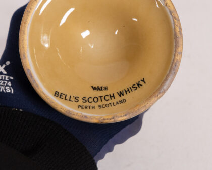 A vintage Bell's Scotch Whisky ceramic bell. These collectable Bells Scotch Whisky ceramic bottles are a novelty item, shaped like bells and featuring the Bell's branding. These unique items have a cream-coloured base with brown accents and gold trim, and the base is marked with 'Wade, Bell's Scotch Whisky, Perth Scotland'. They are in good condition for their age, with some minor wear and tear.