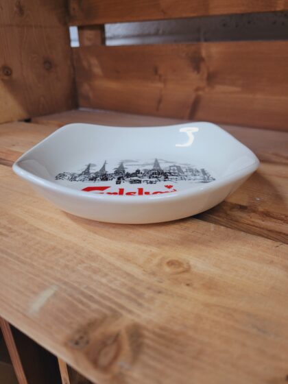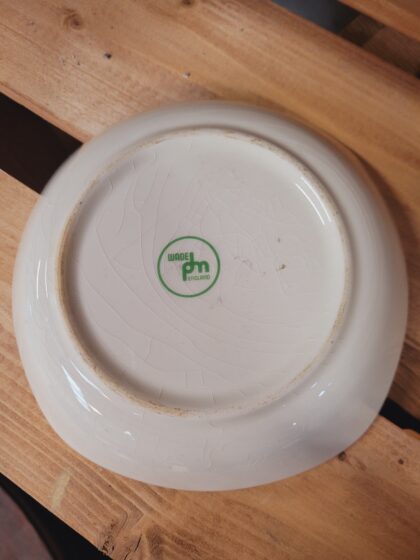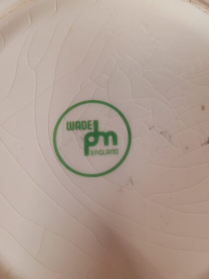 A white glazed ceramic ashtray. Bears red lettering which reads, "Carlsberg" and a black sketch of Copenhagen. Made by Wade and bears green backstamp to base.
