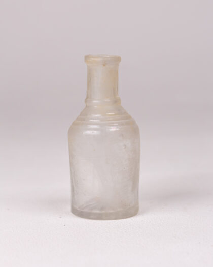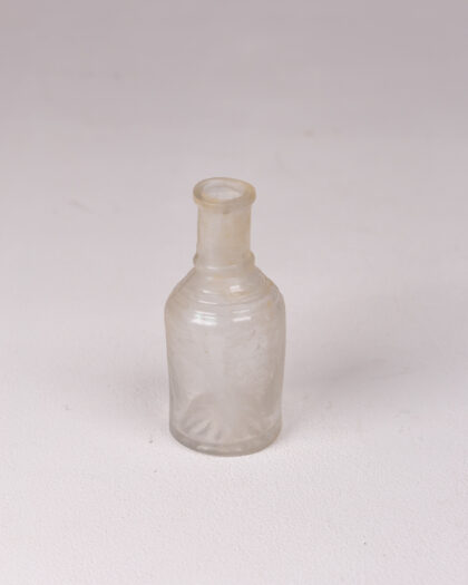 Small clear glass bottle with textured base. Ideal for decorative display or vintage collections.