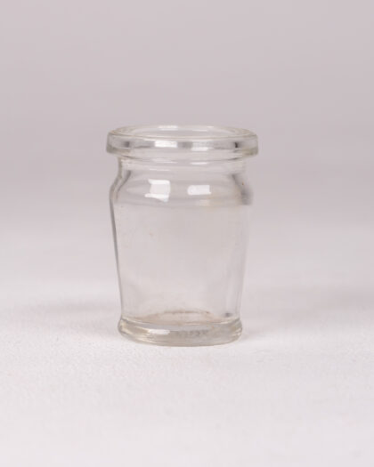 Charming small vintage clear glass jar with a distinctive lip, perfect for versatile storage of trinkets or small household items. Adds vintage appeal to any room.
