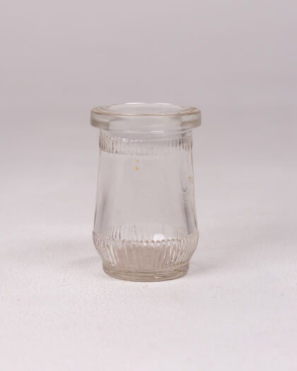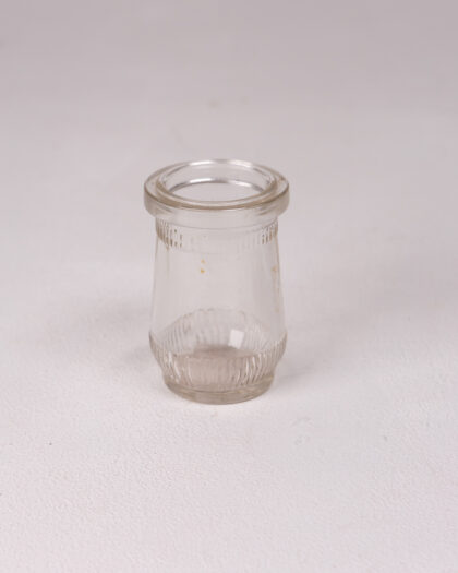 Discover this charming small clear glass jar, featuring elegant ribbed detailing around its base and neck. Its minimalist design seamlessly blends with various interior styles, making it a versatile addition to any room. Perfect for holding small trinkets, single buds, or as a standalone decorative accent. This 'actimel' sized jar is in good condition, ready to enhance your home decor with its simple elegance.