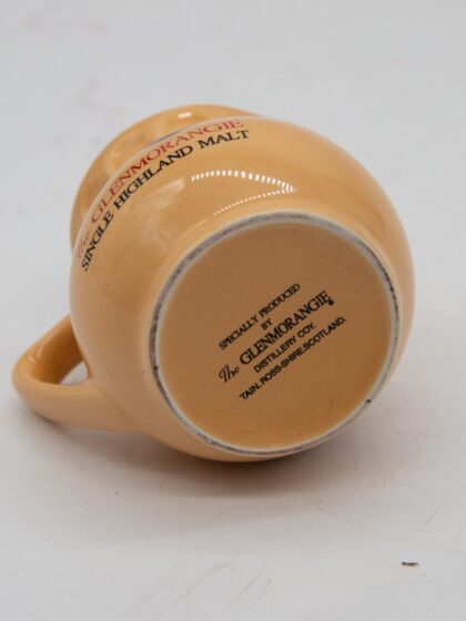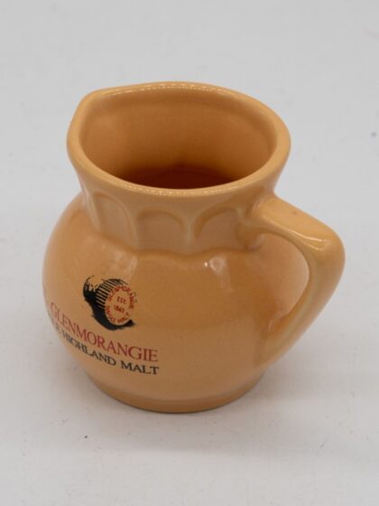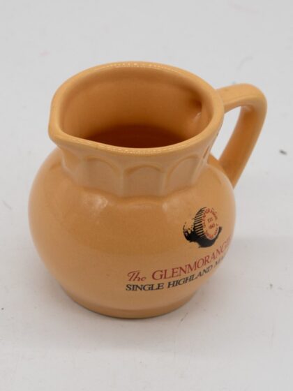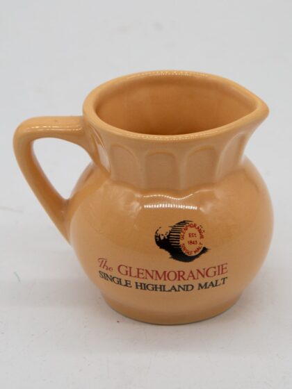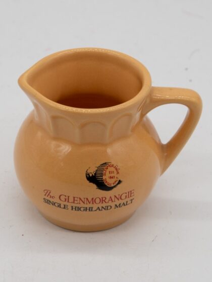 A cream ceramic bartop water jug bearing red and black lettering which reads, "The Glenmorangie Single Highland Malt". Bears black lettering to base which reads, "Specially produced by the Glenmorangie Distillery Coy. Tain, Ross-shire, Scotland".