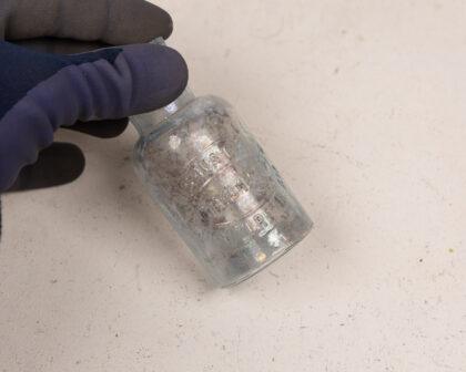 Antique 'Joshua Gibson Manchester Furniture Cream' embossed light blue glass bottle, featuring aged patina. Ideal for collectors.