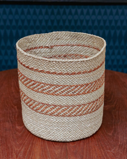 Boasting rust-coloured patterned stripes against a natural grass base, UDONGO was produced by a skilled weaver belonging to a small weaving group of 120 members in the Iringa region of Tanzania. The milulu reeds used to produce these woven storage baskets are often found in swamps and riverbeds, but also grown specifically for basket weaving. Its leaves are cut, split, dyed using natural dyes and dried before weaving begins. Small baskets take up to a week to weave, whilst larger storage baskets can take three weeks.