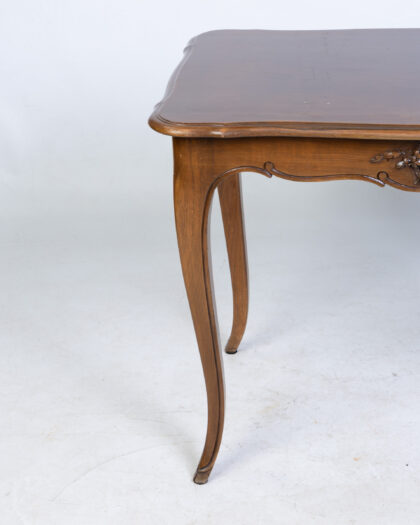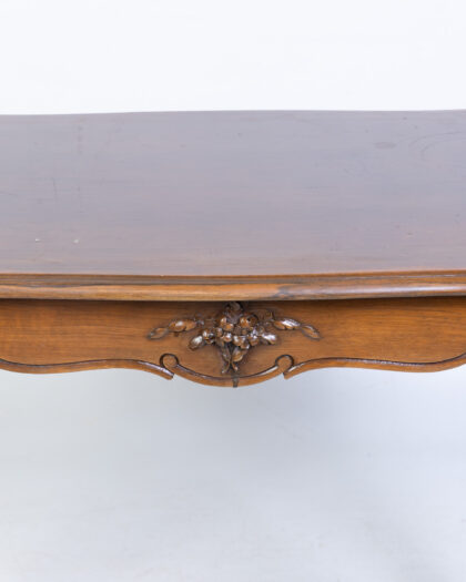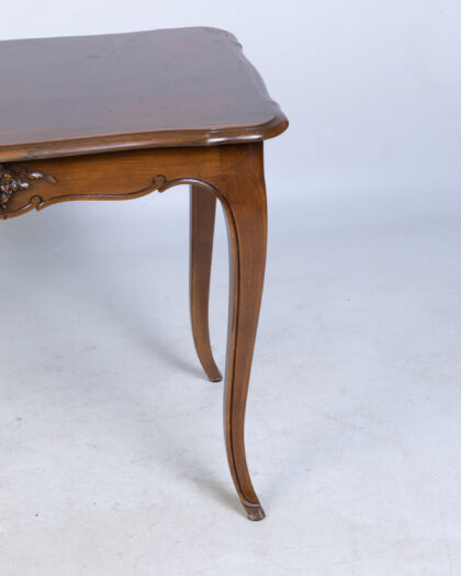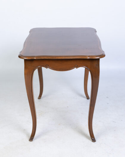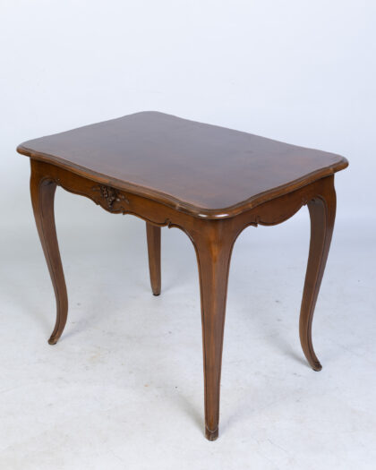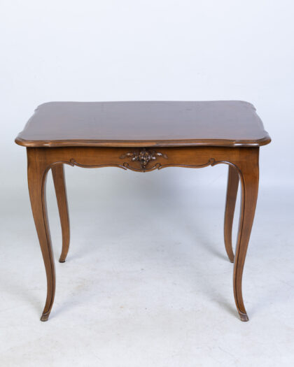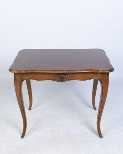 Discover this charming antique mahogany side table, a versatile addition to any living room or bedroom. It features a rectangular top and elegantly curved cabriole legs, complemented by intricate carved detailing along the front apron. This piece embodies a classic and timeless design, perfect for holding a lamp, books, or decorative items. The rich dark brown wood showcases its enduring appeal. There are some light scratches on the top surface, consistent with its age and history, which add to its authentic character.