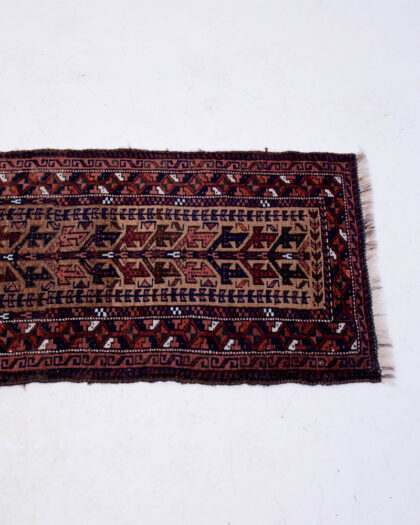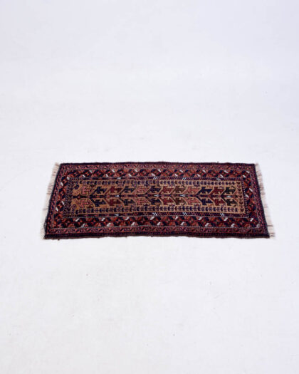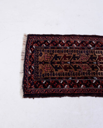This is a small handwoven wool rug featuring a repeating geometric pattern. The predominant colours are brown, red, and black, with small white accent details. The rug has a fringed edge, adding to its traditional aesthetic. The rug appears to be in good condition with only minor wear commensurate with age and use. This rug would make a great addition to any room.