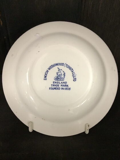 A small white glazed ceramic Schweppes plate with blue lettering and decoration. Made by Enoch Wedgwood (Tunstall) Ltd and bears blue backstamp to base.