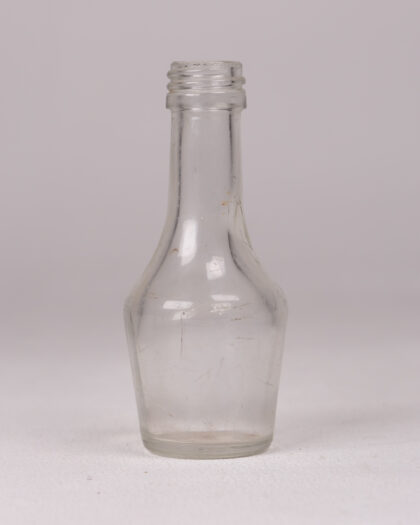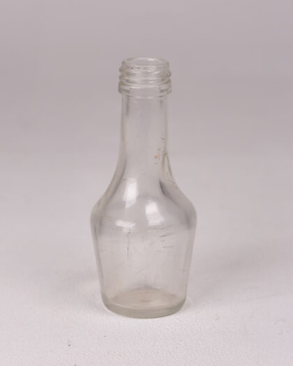Small vintage clear glass bottle with a rounded body and threaded neck, perfect for decorative display.