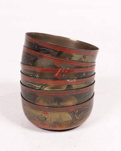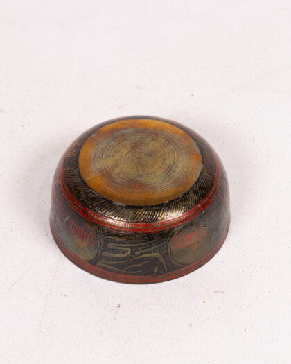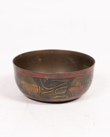 This is a small, vintage-style Indian brass bowl. The bowl features etched and painted detailing. The primary colour is a dark brown, with red and black accents highlighting the etched designs. These designs show detailed scenes of people in traditional dress, possibly depicting village life or folklore. The interior of the bowl is plain brass. This item would work well as a decorative piece or for holding small trinkets.