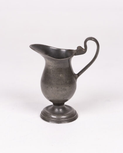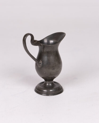 This is a vintage pewter jug or small pitcher. It features a classic design with a pedestal base, a rounded body, and a curved handle. The pewter has a slightly aged patina, adding to its vintage charm. Perfect for serving cream or as a decorative item.