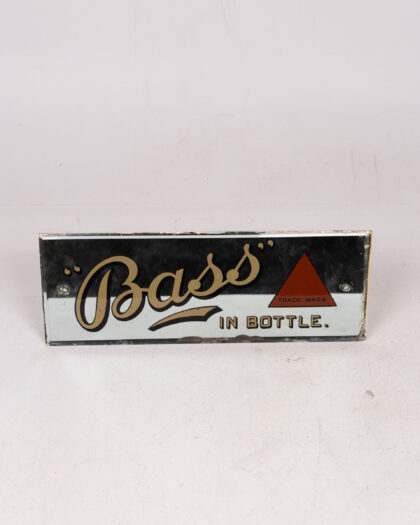 Vintage Bass Ale mirror, rectangular and unframed. The mirror features 'Bass' written in gold script. A red triangle with 'TRADE MARK' inside it is printed beside the text. "IN BOTTLE." is printed in gold underneath. The mirror has mounting holes on two sides, with signs of wear and aging, adding to its vintage appeal. This piece is a great addition to a home bar, kitchen, or man cave, bringing a touch of classic pub culture to any space.