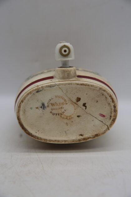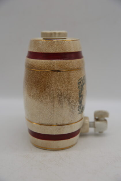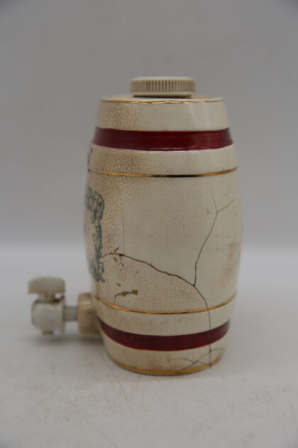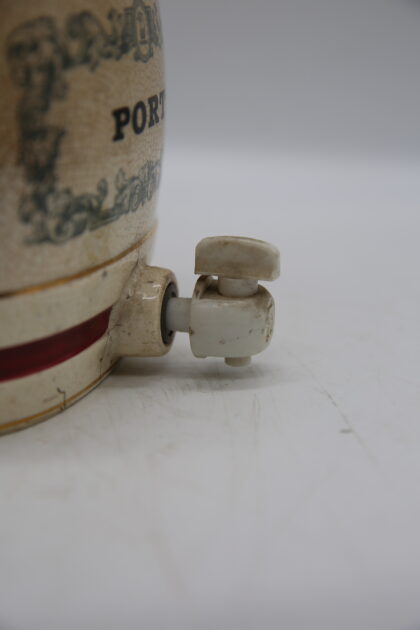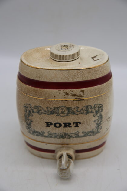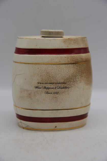 A white glazed ceramic decanter complete with lid and tap. Bears black lettering which reads, "Port W & A Gilbey Limited Wine Shippers & Distillers Since 1857". Made by Wade and bears gilt backstamp to base. This has been cracked quite badly before and glued back together.