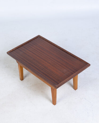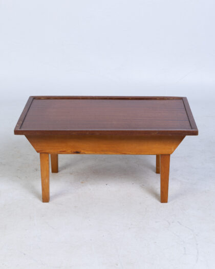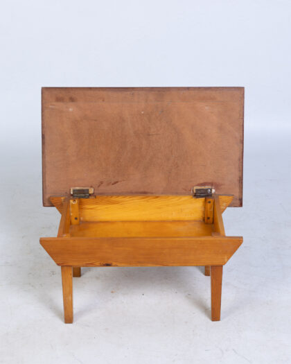 Charming vintage solid wood storage table with a functional lift-top lid. Perfect as a versatile side table or compact coffee table, offering practical storage for any room. Features a warm brown exterior and natural interior, ideal for a child's room or living space.