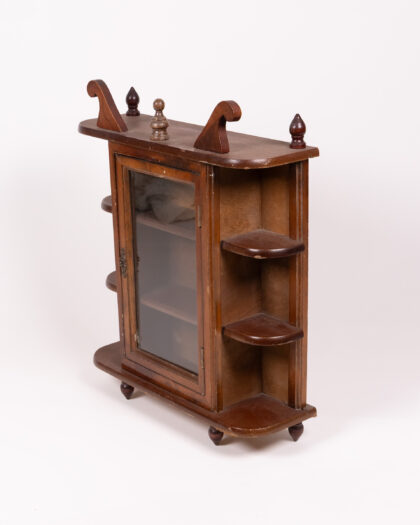 This is a small curio cabinet constructed from wood and glass. The predominant colour is brown. It stands on small, turned feet and features a glass door, revealing shelves inside for displaying small items. The door has a simple metal latch. Additional curved shelves flank the cabinet on either side. There are decorative finials on the top of the cabinet. The condition is consistent with age, showing wear and minor imperfections in the wood finish.