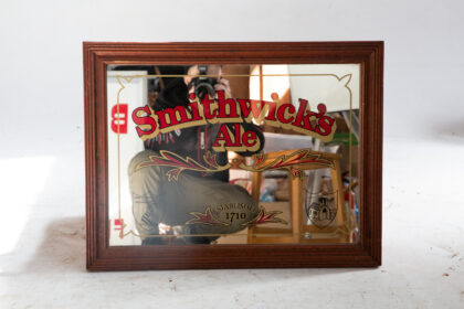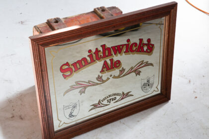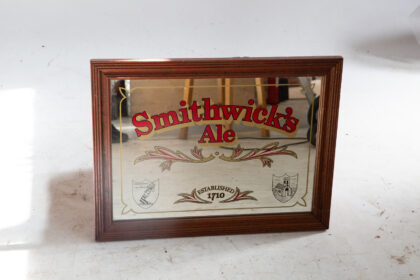 A framed advertising mirror. Bears gilt decoration and red and black lettering which reads, "Smithwick's Ale Established 1710"