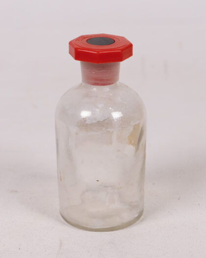 Vintage clear glass bottle with a red plastic stopper, ideal for storing potions and other curiosities.