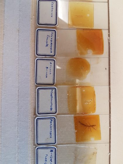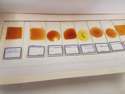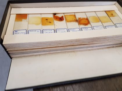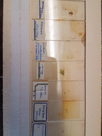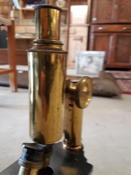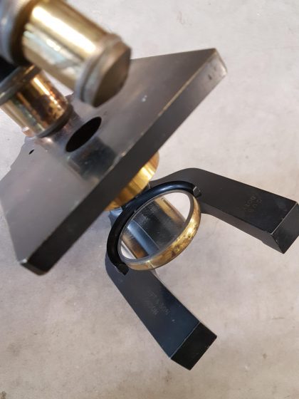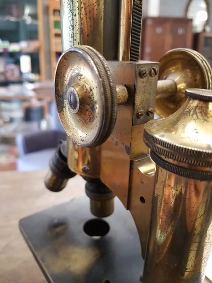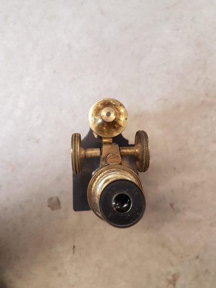 A lovely c1910 brass microscope with over 100 botanical slides. Made by J Swift & sons for Queens University Belfast Botany Department.