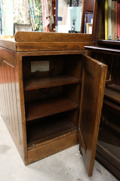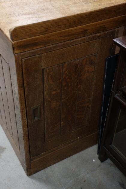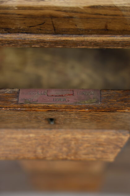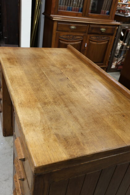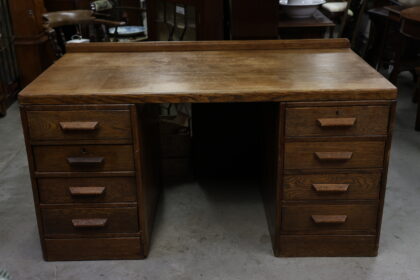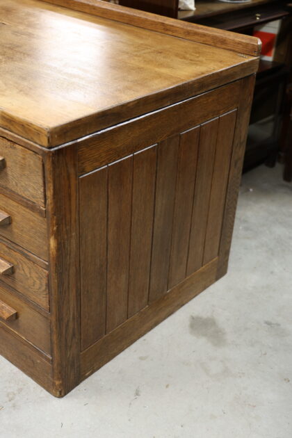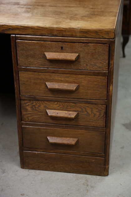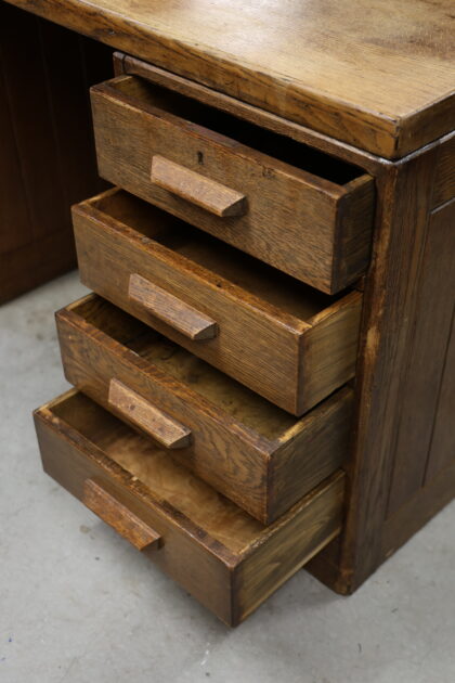 One side has drawers and the other features shallow cupboards. There is a rail on one side of the desk which could be possibly be removed to turn it into a partners desk. Made by Hobbs & Co. London.