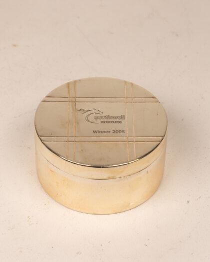 This elegant trophy features a polished finish and is engraved with 'Southwell Racecourse Winner 2005'. It is a collectible item, ideal for enthusiasts of horse racing memorabilia. The trophy is in good condition with some signs of wear consistent with age. It measures approximately 10 cm in diameter and serves as a striking conversation piece or a unique addition to a collection.