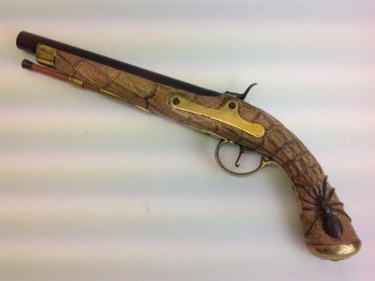 Hand-carved pistol with motif and web of spider on both sides of stock