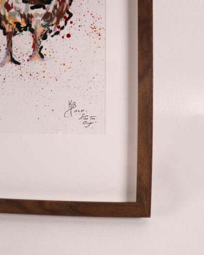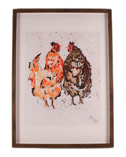 This is a brand new framed painting by the artist Kate Broderick. It depicts two chickens, one predominantly orange and the other brown, standing side by side. The painting is signed by the artist in the lower corner. The art has a splattered style with orange, brown, and black spots around the main subjects. The frame is wood with Perspex. This chicken painting is ready to display in any room.