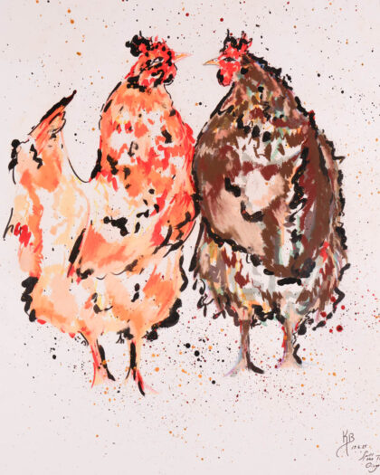 Framed painting by Kate Broderick featuring two chickens. Signed by the artist, this lovely painting is ready to display.