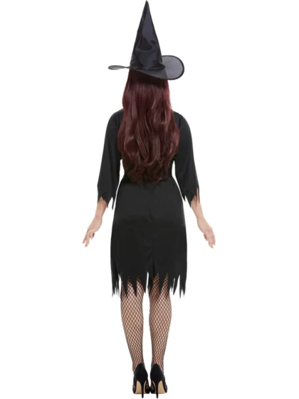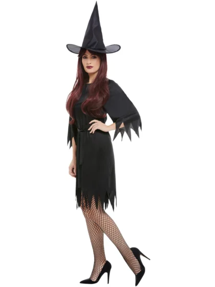Black Spooky Witch Costume with jagged hem dress, waist belt & pointy hat. Perfect Halloween dress-up!