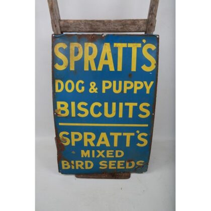 A blue enamel sign. Bears yellow lettering which reads, "Spratt's Dog & Puppy Biscuits Spratt's Mixed Bird Seeds".