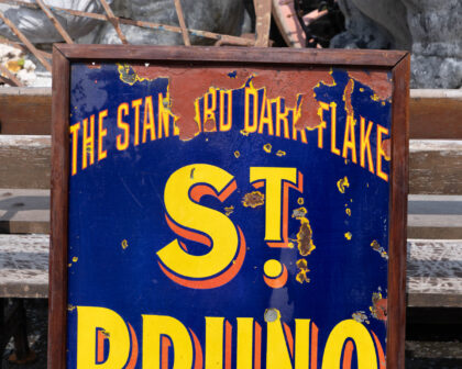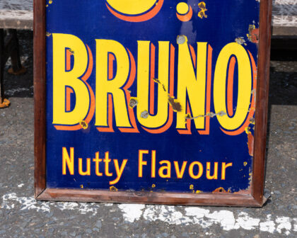 This sign is for St. Bruno tobacco. With a striking blue background and bold yellow lettering, the sign proudly displays the brand name and the phrases, "The Standard Dark Flake" and "Nutty Flavour". The sign is framed with a simple wooden border. The sign is in distressed condition, with rust, scratches, and peeling paint throughout, adding to its vintage charm. This sign would make a great display piece in a home bar, study, or man cave, or for a collector of vintage tobacciana.