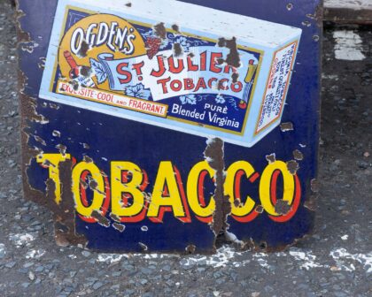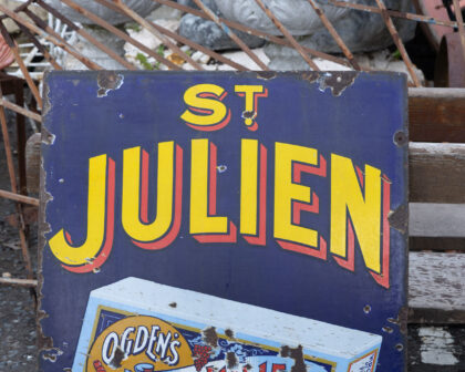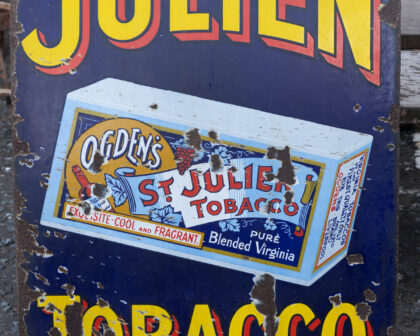 St. Julien Tobacco enamel advertising sign. Worn condition adds vintage charm. Unique decor for collectors.