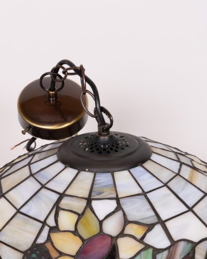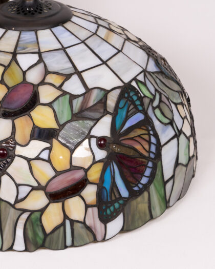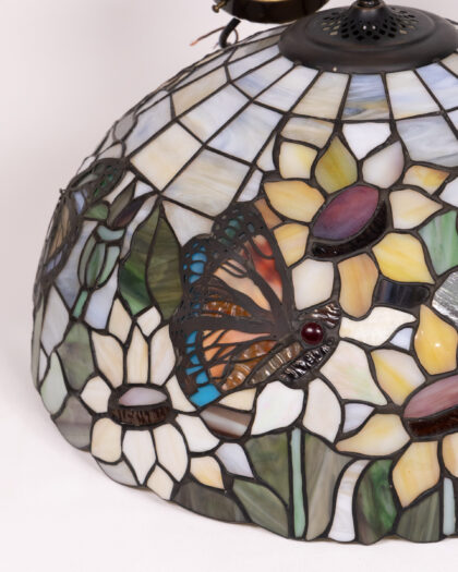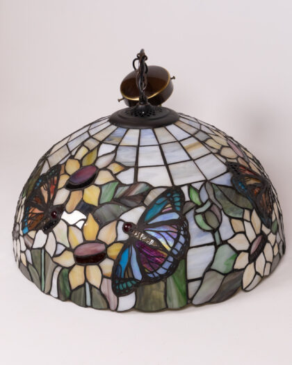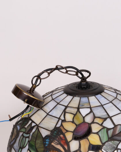This ceiling light features a beautiful stained-glass shade with a design of white flowers and colourful butterflies. The shade has a mosaic pattern in pastel blue. The fitting is dark brown/bronze in colour and has a chain suspension. This light fitting is a beautiful and eye-catching item for any room. The fitting will require some electrical work.