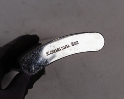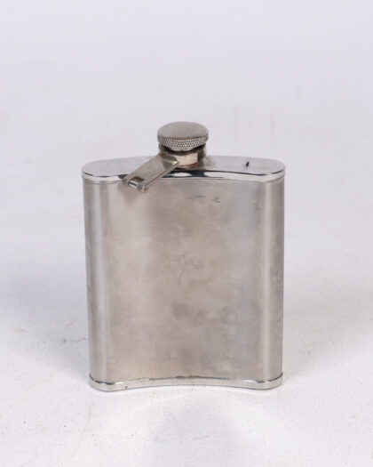 A 6oz capacity hip flask, crafted from stainless steel with a shiny silver finish. Features a screw-top lid attached to a hinged arm to prevent loss. The flask has a rounded, rectangular shape that fits comfortably in a pocket. Stainless steel is marked on the base. It is in very good condition, the surface is highly reflective with no dents or noticeable scratches.