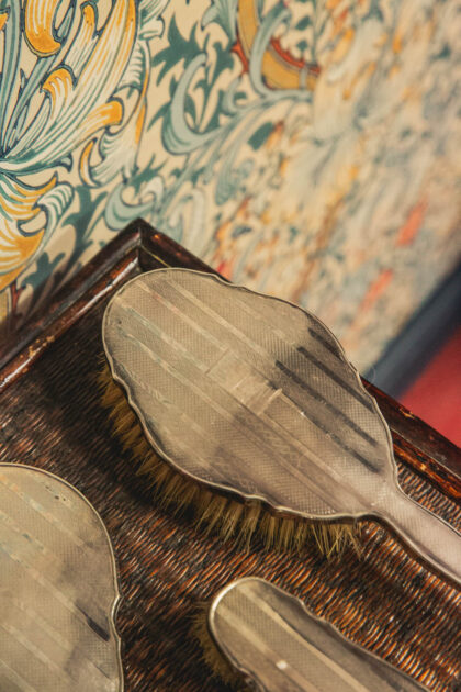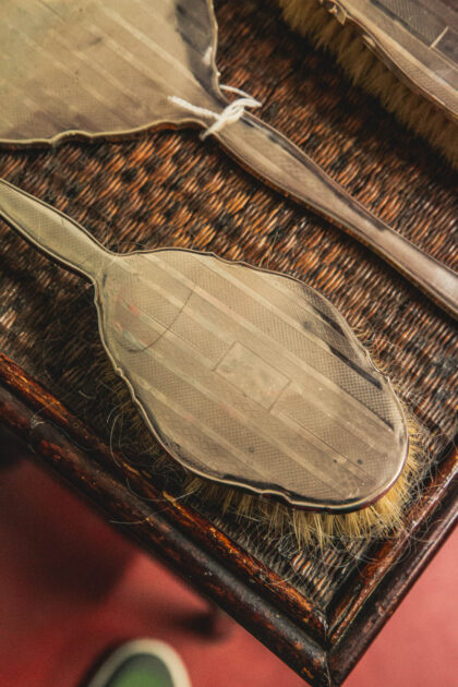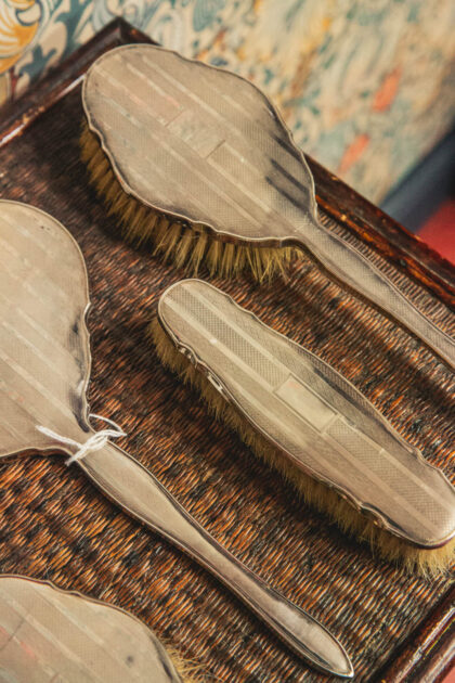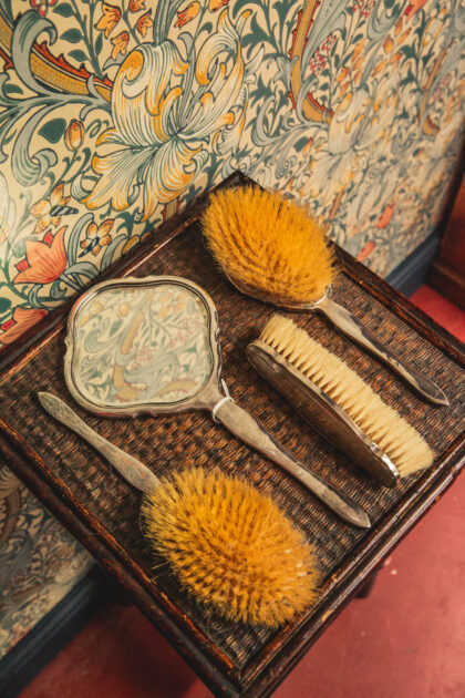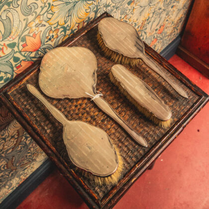 Features a mirror and three brushes.