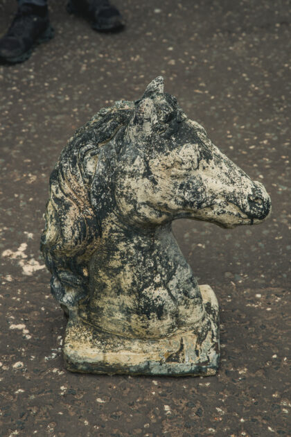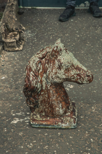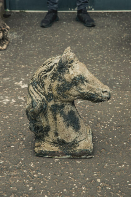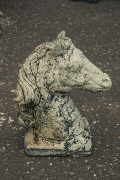 A vintage composite half size stone horses head garden ornament.