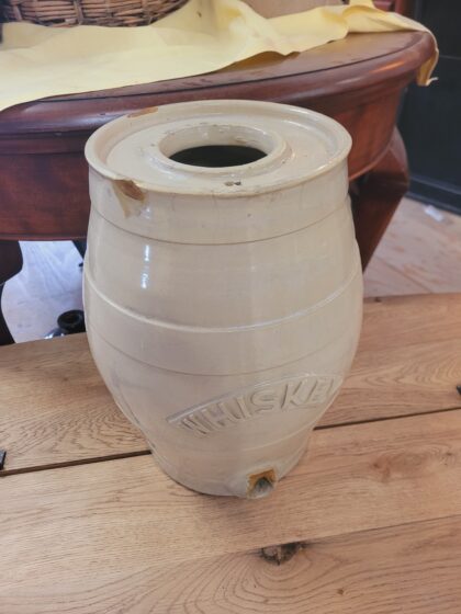A cream glazed stoneware decanter bearing extruded "Whiskey" emblem. Missing a tap and lid.