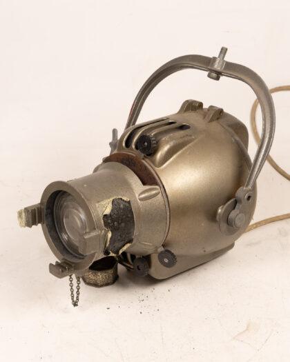 Vintage Strand Electric stage light, untested. Features a silver finish, adjustable yoke, and lens. Shows wear and tear. The front casing has chips and missing pieces, and the electrical cord appears old. Sold as is, untested.