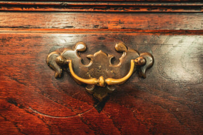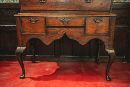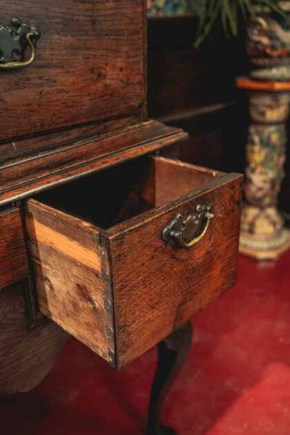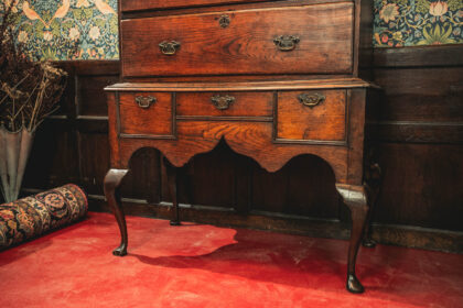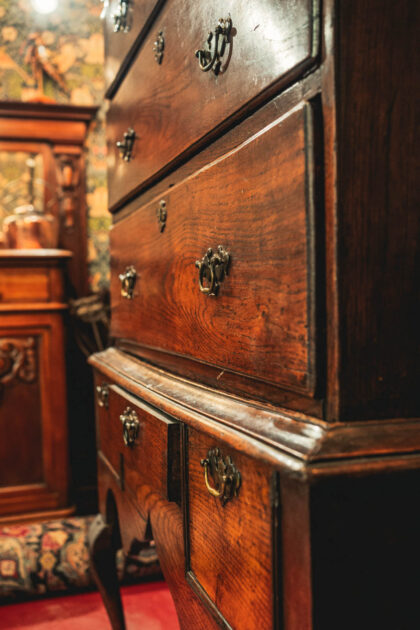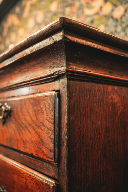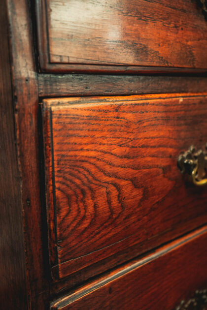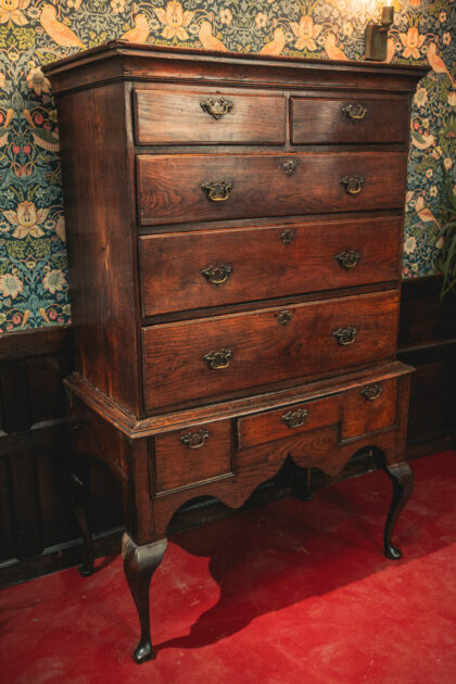 A stunning Georgian chest on stand. This item has lasted the test of time. Being from around 1750 to 1790. It is an impressive piece, standing standing over five and a half feet tall. Finished with decorative brass handles and brass escutcheon. There is some ware as you would expect from a piece that is nearing 300 years old. This Georgian Chest is solid and has a beautiful patina adding to its dark oak finish.